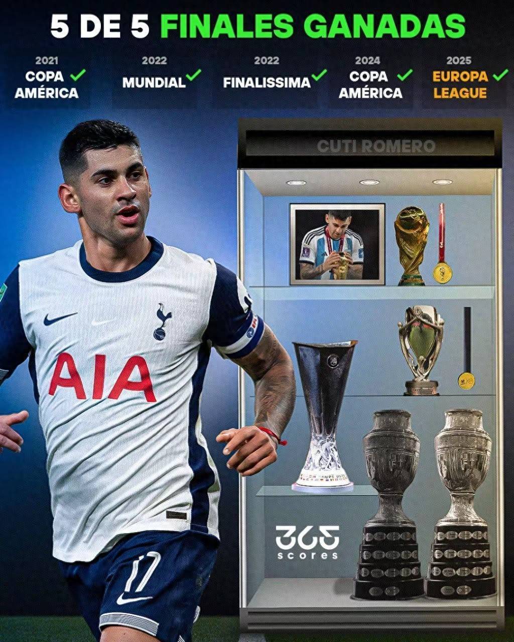 2025年欧联杯决赛,热刺1-0曼联,罗梅罗打满了全场!2024年美洲杯决赛,阿根廷加时1-0哥伦比亚,罗梅罗打满了全场!2022年世界杯决赛,阿根廷点球大战7-5法国,罗梅罗打满了全场!2022年欧美杯,阿根廷3-0意大利,罗梅罗首发出战85分钟。2021年美洲杯决赛,阿根廷1-0巴西,罗梅罗首发出战79分钟。不得不说罗梅罗真是大场面冠军属性的球员,越是决赛这样的重要比赛,越是冷静发挥稳定,你还记得世界杯决赛罗梅罗跪地门前传球吗?